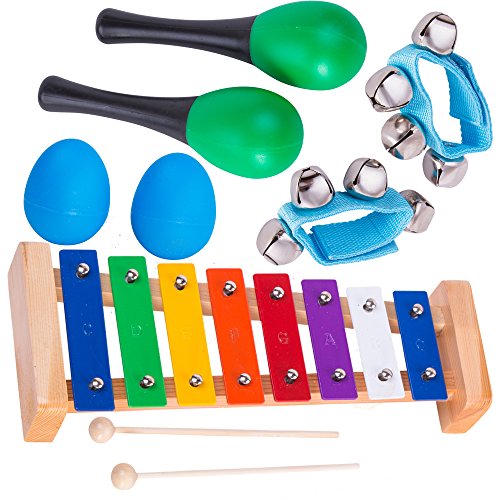 PERFEKTES GESCHENK für Ihre Kleinen. Unser Set mit Schlaginstrumenten enthält 2 Rumbakugeln, 2 Rassel-Eier, 2 Glockenschellen und 1 Glockenspiel. Eine großartige Auswahl für musikalische Anfänger, das SPASS FÜR STUNDEN garantiertLEHRREICH - Seit Jahren beweisen Studien, dass Musik langfristige Vorteile in der Entwicklung von Babies und Kleinkindern bieten